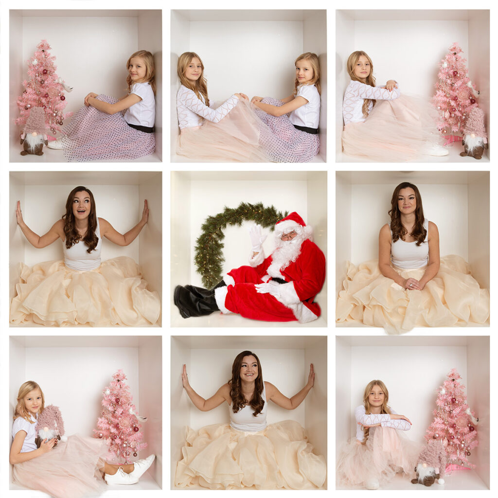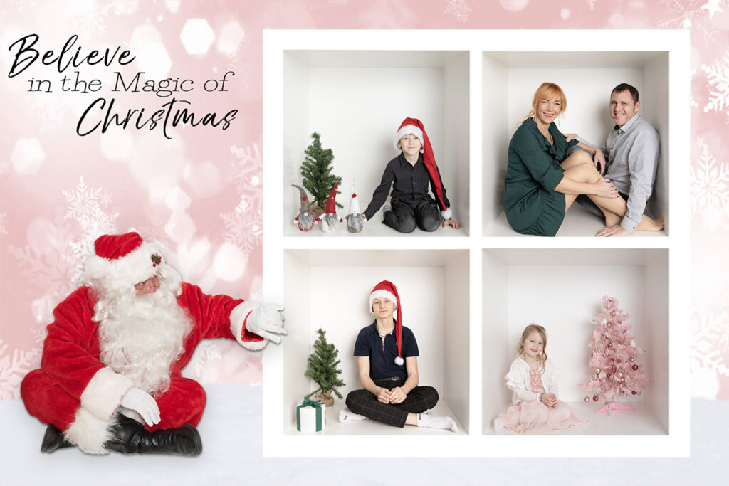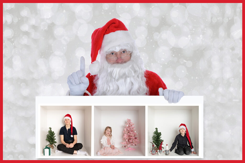 Pildistamisel kasutame vahvaid aksessuaare – päkapikumütse, kingipakke ja muid jõuluteemalisi elemente, et luua tõeliselt pidulik atmosfäär. Soovi korral saab fotodele lisada töötlemisel jõulutervitusi või isegi jõuluvana, et muuta need veelgi erilisemaks.